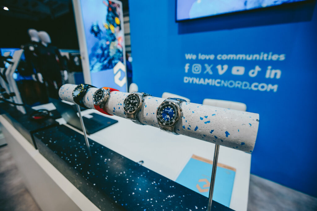 - Sustainability was further brought to life through the use of specially made recycled acrylic displays, including bespoke dive watch and regulator showcases. These not only highlighted key products but also provided a tangible representation of Dynamic Nord’s environmental ethos.